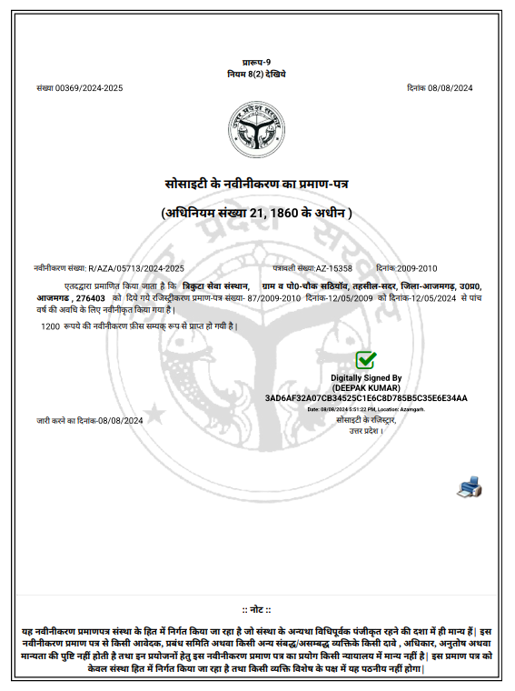 Trikuta Seva Sansthan is a not- or-profit organization committed to serving marginalized communities through education, healthcare, livelihood promotion, and social empowerment. The organization was originally registered in 2009 under the name Nayaman Seva Sansthan. In 2021, after internal restructuring, it was renamed Trikuta Seva Sansthan. Since then, the Sansthan has been working with renewed energy and vision, and is now recognized as a trusted partner in development across Eastern Uttar Pradesh and beyond.
